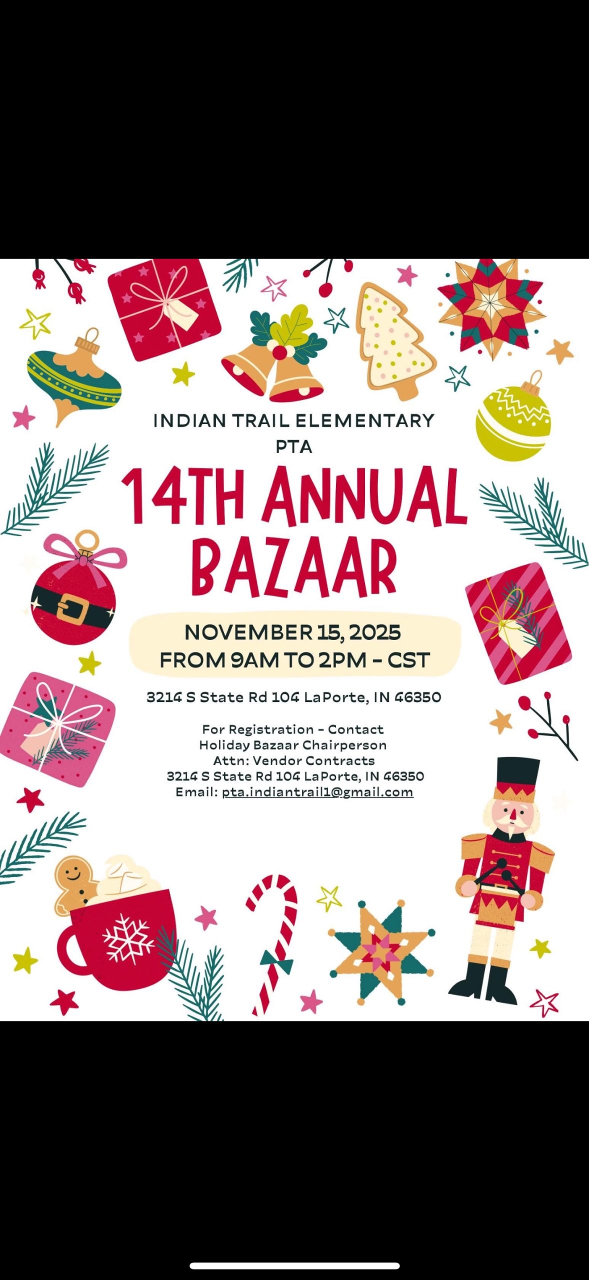 Join us for the Indian Trail Elementary PTA Holiday Bazaar! FREE ADMISSION! Artisans, bakers, direct sales, and more make this event a one stop shop for your holiday shopping!