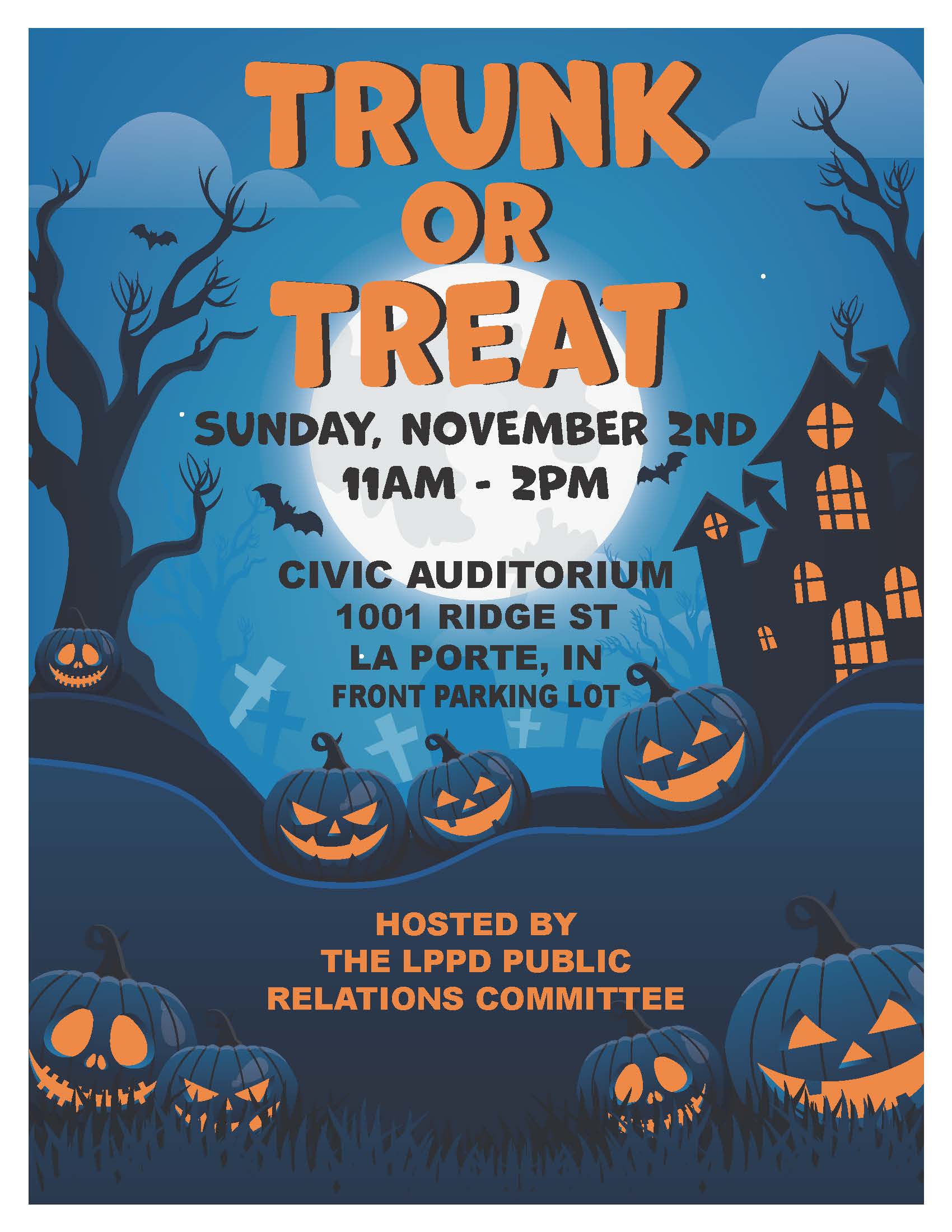 Home Events LPPD: Trunk or Treat LPPD: Trunk or Treat + Add to Google Calendar + iCal / Outlook export 00 days 00 hours 00 minutes 00 seconds Date Nov 02 2025 Time 11:00 AM - 2:00 PM Location La Porte Civic Auditorium La Porte Civic Auditorium LaPorte IN United States 46350 Share this event